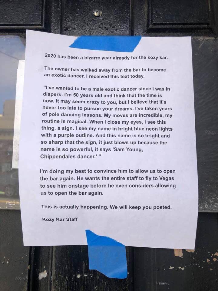 Only in SF do you see a bar close because the owner wants to become an exotic dancer