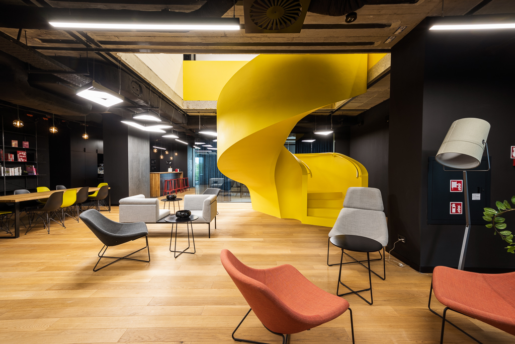Yellow spiral stairs, wooden floors and industrial lighting …