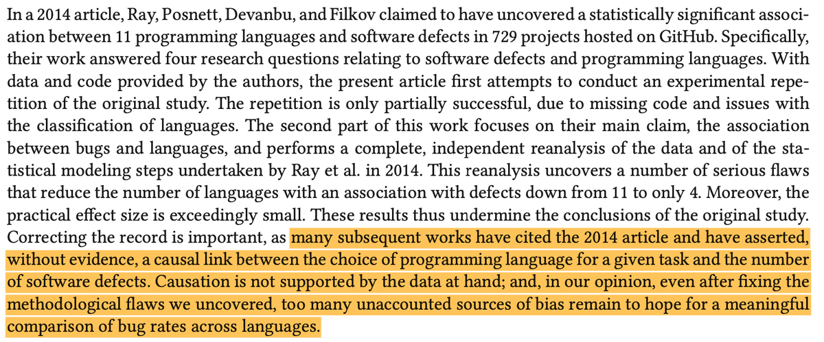 @AndreasStefik & co on productivity value of static typing (https://link.springer.com/article/10.1007/s10664-013-9289-1 …) because it recognizes many relevant threats to validity (eg familiarity, learning effects).1 reply 0 retweets 4 likes