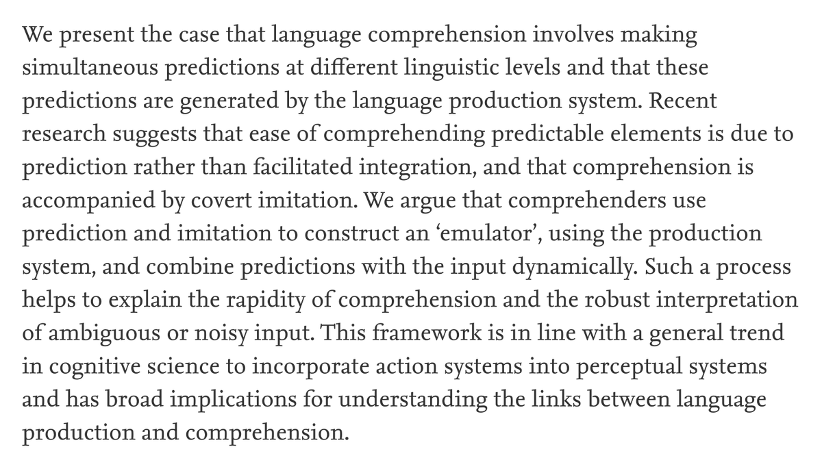 Will Crichton @wcrichtonBtw, cogsci research suggests this is true for many skills: the ability to execute underlies the ability to understand. See: - "Do people use language production to make predictions during comprehension?" - "The Case for Motor Involvement in Perceiving Conspecifics" https://twitter.com/lindsey/status/1353134942901858305 … pic.twitter.com/SkHTEgAKV21 reply 0 retweets 3 likes -