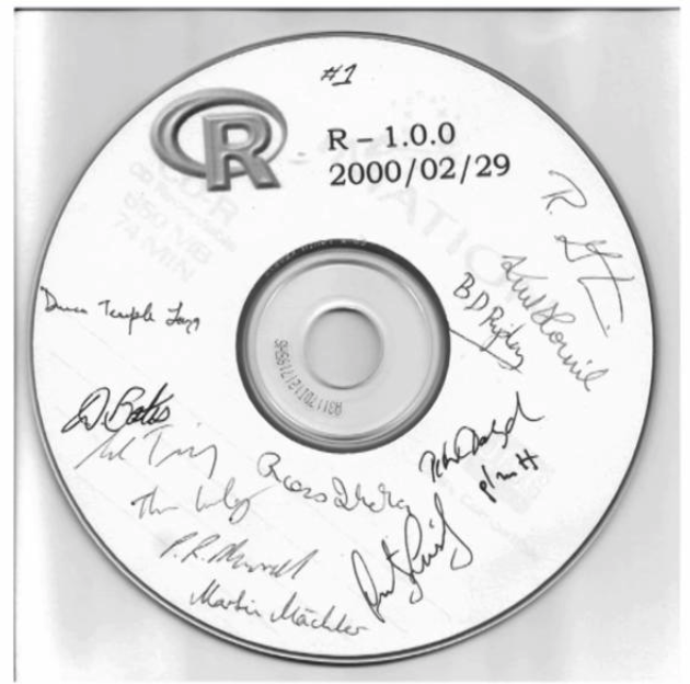 John Chambers talks about the history of S, R, and data science. Shows off this awesome memorabilia: first created CD of R signed by the dev team.pic.twitter.com/GLQmMervyD