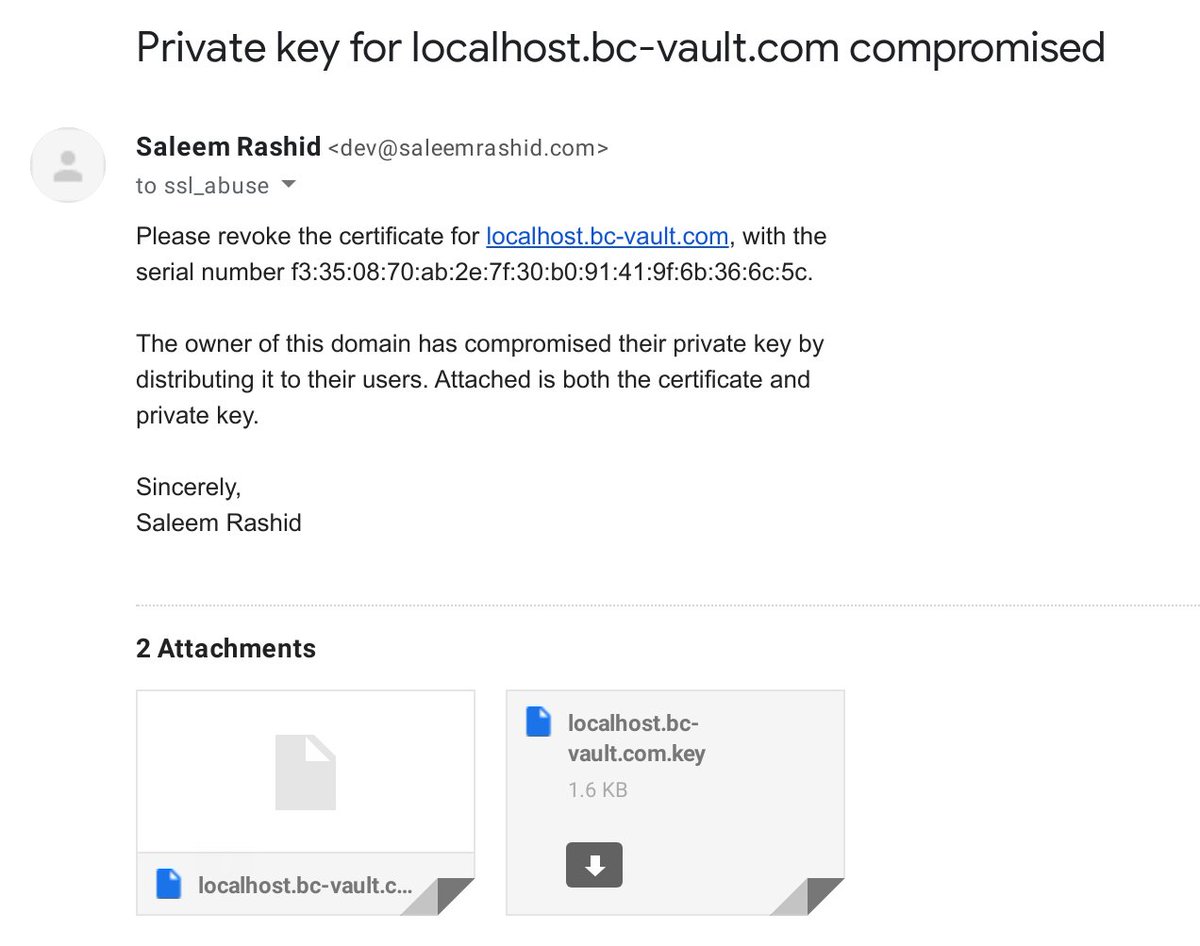 It is the CA's duty to revoke certificates issued for private keys that have been compromised (e.g. released to the public). If your social experiment is to see how a CA treats a customer who repeatedly proves that they are unable to control their private key material, go nuts?pic.twitter.com/XlrqHFk7Xz