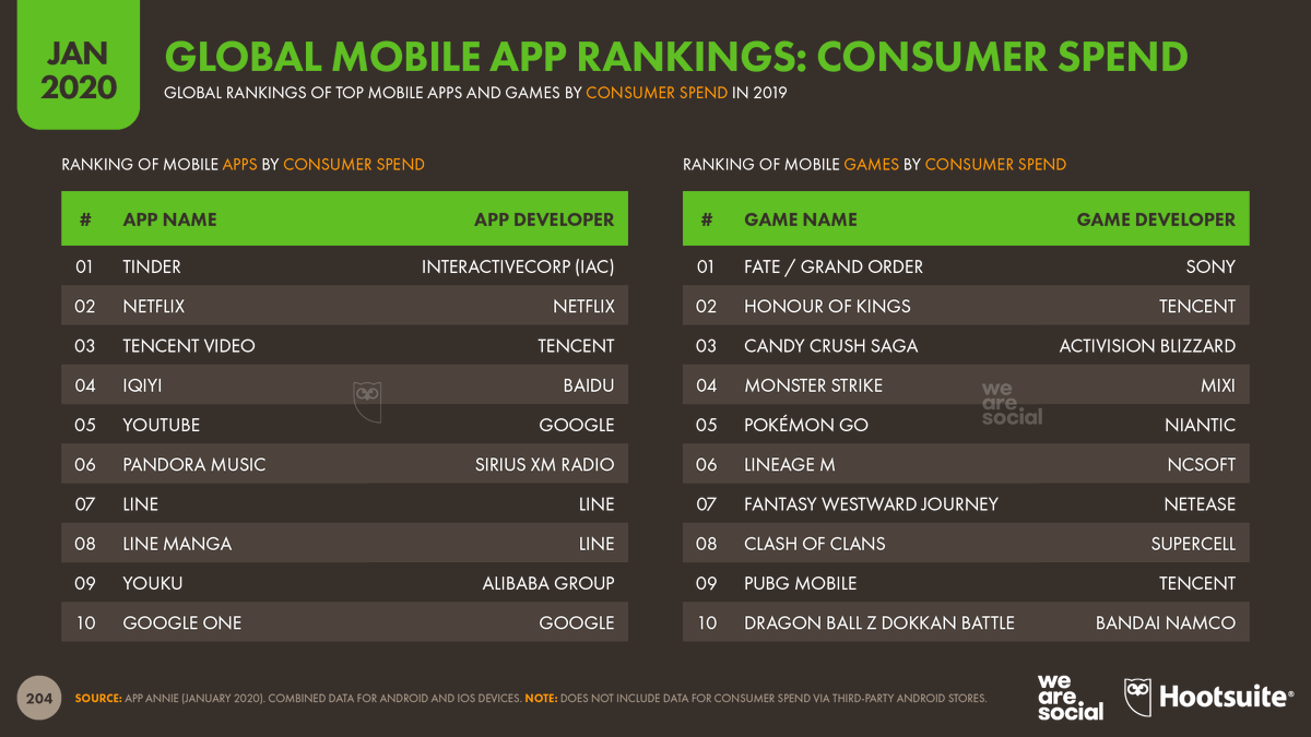 The price of love: Tinder generated more revenue than any other non-game app in 2019. US$2.2 billion was spent on all dating apps during the course of 2019 – twice as much as the same category two years ago.