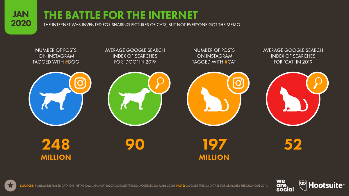 @wearesocial x@hootsuite reports has been released. Always a valuable resource for benchmarking and understanding the bigger picture about digital usage (as well as the truly important questions like cats vs dogs) https://wearesocial.com/blog/2020/01/digital-2020-3-8-billion-people-use-social-media …pic.twitter.com/AsHeJHfVnE
