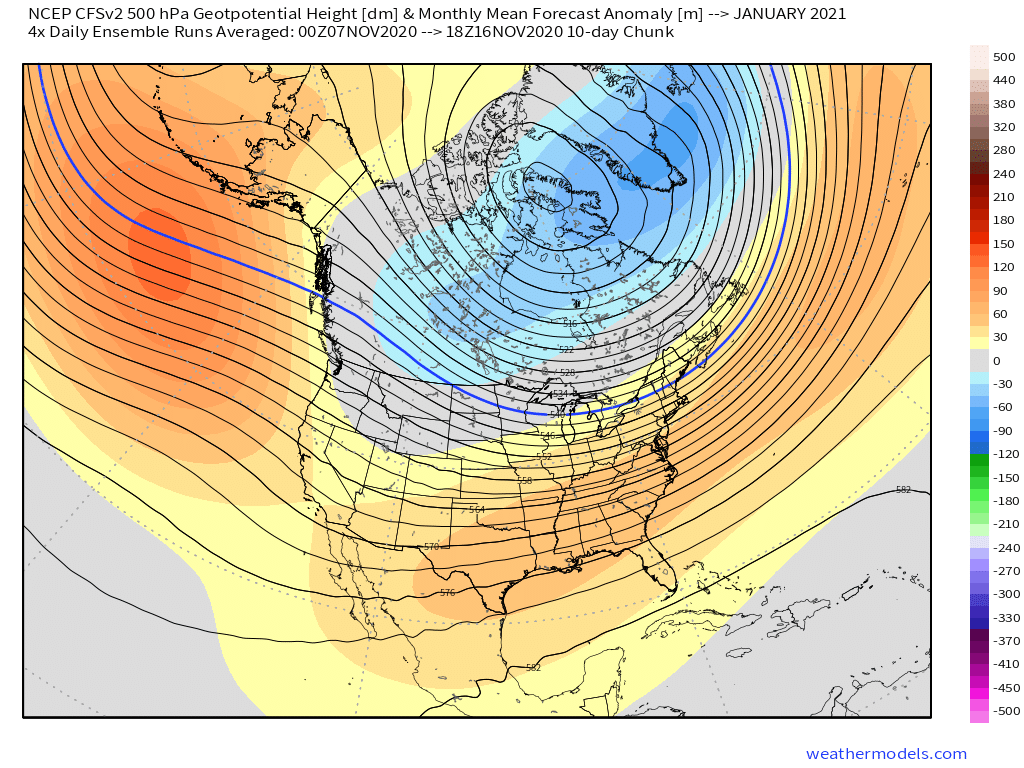 A look ahead with the NCEP CFS model (found in the http://weathermodels.com model lab) shows mean ridging for much of the US during January. Much of the country is modeled to be warmer than average for the month, too. Of course, short-term patterns can differ considerably. JFpic.twitter.com/j178TikQiz