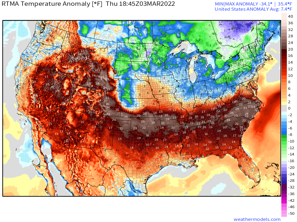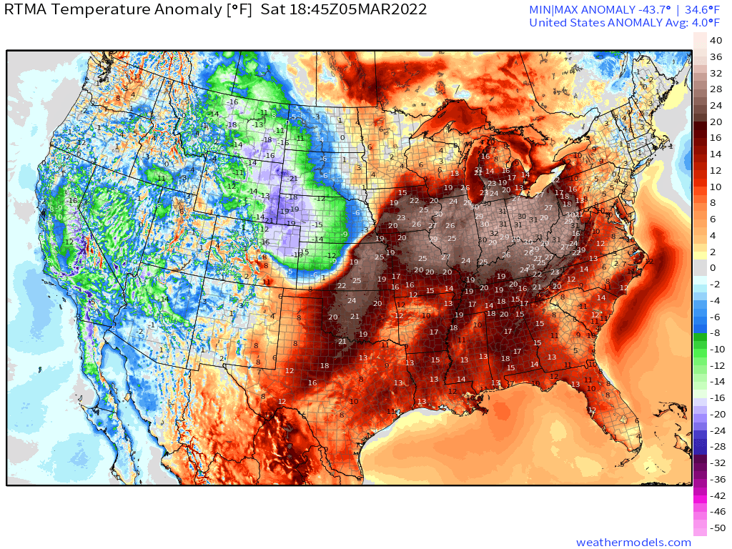 Strong ridging will once again bring record highs to a swath of the central US today. Positive temperature anomalies, centered around Missouri, will approach 30°F. http://weathermodels.com JFpic.twitter.com/0HKCDezfq6