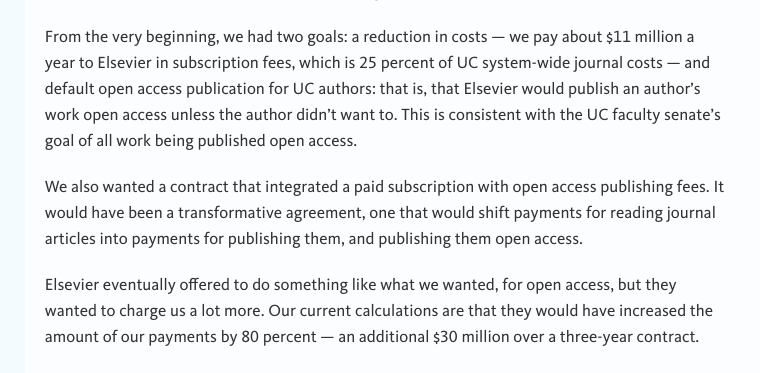 The sticking point in UC's split with Elsevier was UC's demand that all UC authors be permitted to publish their work open access. "We want the public and the world to have access to research... that is funded by the public in the first place." 🙌 https://www.universityofcalifornia.edu/news/why-uc-split-publishing-giant-elsevier …pic.twitter.com/c1GnlJlgso