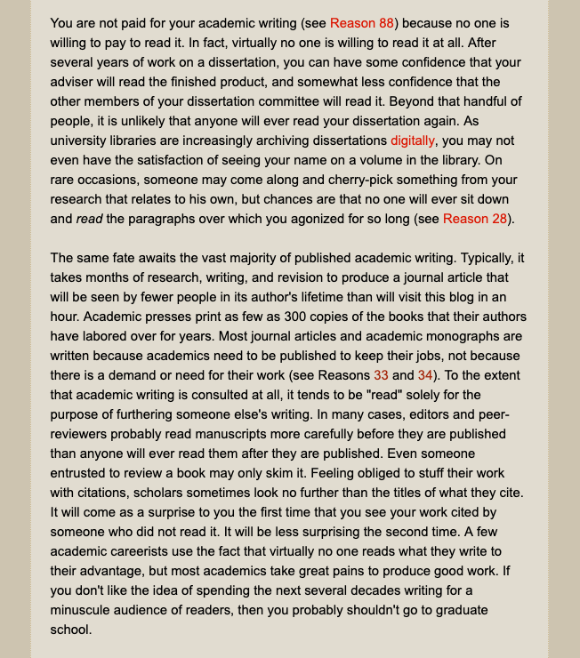 Into the fray I'll toss this post from the anonymous blog "100 Reasons NOT to Go to Grad School," along with a couple hundred comments on the unbroken spines on a mountain of academic work that died in the shell http://100rsns.blogspot.com/2013/03/89-virtually-no-one-reads-what-you-write.html …pic.twitter.com/9h8vwHCGFg