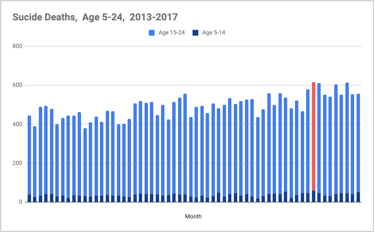 I actually tried to pull the data they looked at (though I could only find CDC data aggregated by age into clusters for 5-14 & 15-24 years) to visualize. What I saw showed a clear & concerning upward trend in suicides over 5 years but nothing remarkable for April 2017