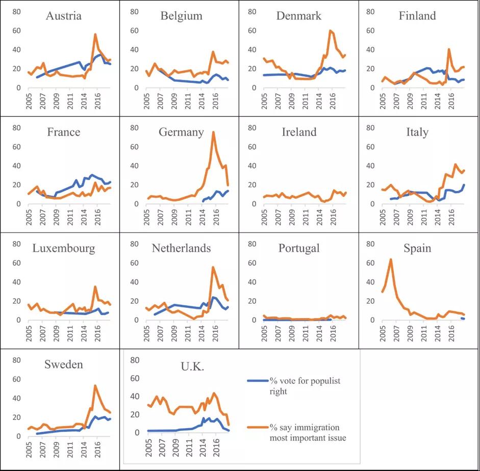 It seems like there was *maybe* just a massive spike around Brexit, without which it looks plausible that the correlation with votes for the populist right might've been quite a lot stronger