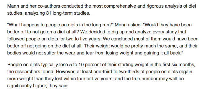 "We decided to analyze every study that followed people on diets...most would have been better off not going on the diet. Their weight would be pretty much the same, and their bodies would not suffer the wear and tear from losing weight & gaining it back" http://newsroom.ucla.edu/releases/Dieting-Does-Not-Work-UCLA-Researchers-7832 …pic.twitter.com/CVEg5wAaC0