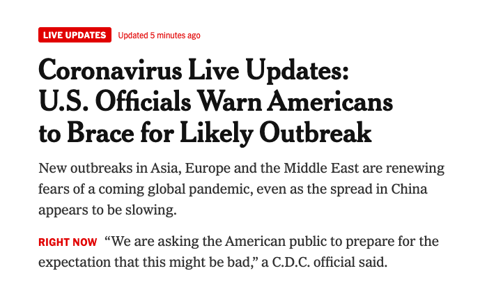 "It’s not so much of a question of if this will happen in this country any more but a question of when this will happen." — Dr. Nancy Messonnier, director of the National Center for Immunization and Respiratory Diseases https://www.nytimes.com/2020/02/25/world/asia/coronavirus-news.html …pic.twitter.com/zykHpFTkah
