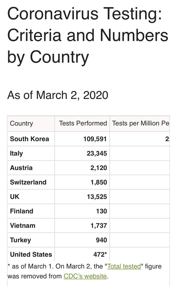 """ United States, Tests Performed: 472* * as of March 1. On March 2, the "Total tested" figure was removed from CDC's website. """ https://www.worldometers.info/coronavirus/covid-19-testing/ …pic.twitter.com/V7YRvBtonh