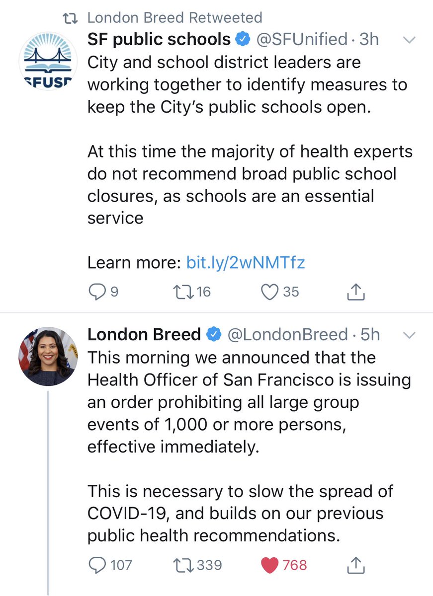 SF mayor just announced an outright ban on gatherings of 1,000 people ...and then RT'd a reassurance that the city will avoid closing schools which, last I checked, could quite often be described as mandatory gatherings of 1,000+ people occurring 5 days/week & lasting ~7 hourspic.twitter.com/8skL5ZArOr