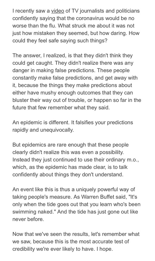 In February, I predicted that the "just the flu" journalists mocking hypochondriac nerds would see zero repercussions for their absurdly irresponsible storytelling I think it's been my most profoundly failed COVID prediction to date 👍 https://twitter.com/paulg/status/1247096270956658688 …pic.twitter.com/8QL3wcjGy1