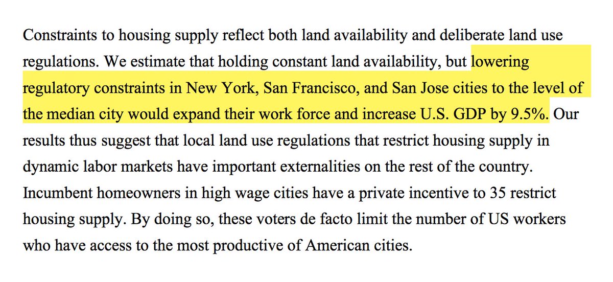 Eliminating artificial constraints on the housing supply in just New York, San Francisco & San Jose could feasibly increase the U.S. GDP by 9.5% https://chicagounbound.uchicago.edu/cgi/viewcontent.cgi?article=1045&context=housing_law_and_policy … pic.twitter.com/Cr2YVUf5PT