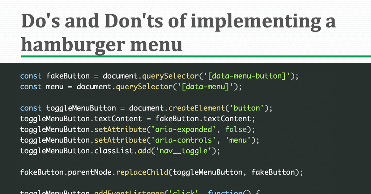 «Хорошо» и «плохо» при реализации гамбургер-меню. Майкл Шарналь собирает правильные практики для создания удобного и доступного переключателя навигации — https://justmarkup.com/articles/2019-12-04-hamburger-menu/ …pic.twitter.com/X5KLHfEocB