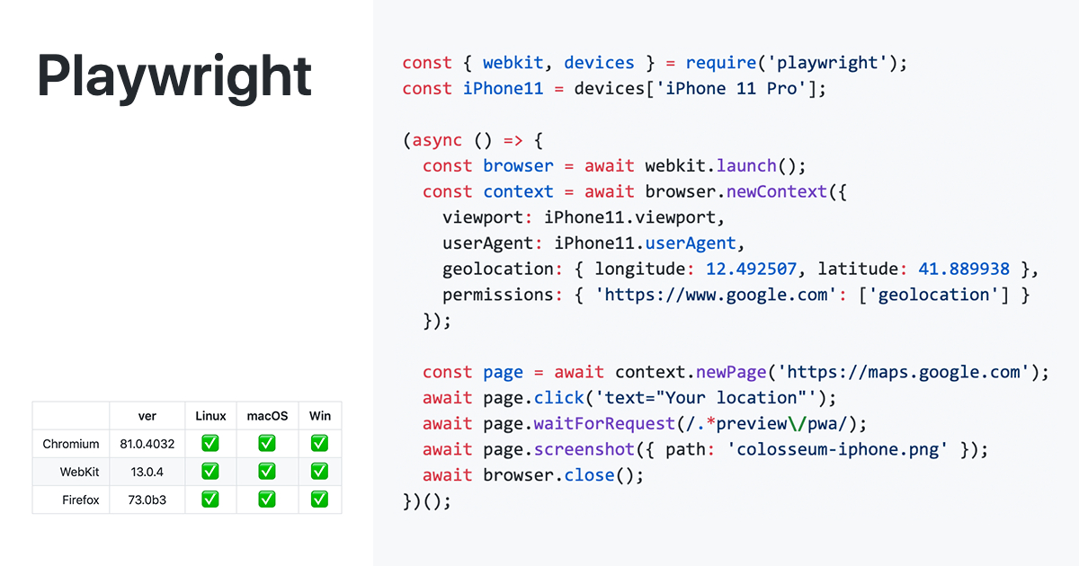 Playwright — библиотека автоматизации браузеров от Microsoft, аналог Puppeteer и от создателей Puppeteer. Поддерживает управление Chromium, WebKit и Firefox — https://github.com/microsoft/playwright …pic.twitter.com/5zh4mmHLgj