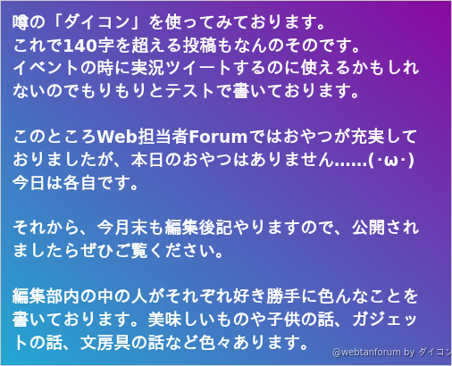 ダイコン使用感テストです。10000字まで入力できるサービスとのことですので、ぜひイベントの実況ツイートでもご活用くださ… 文章を画像に「ダイコン」で投稿されました。 https://daicon.me/posts/1314