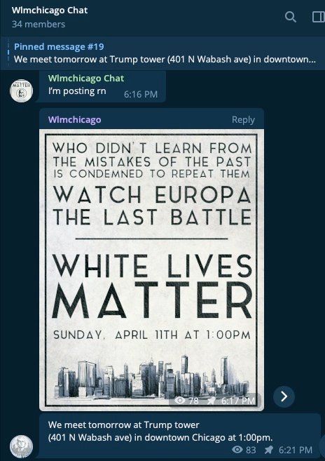 #Chicago Anti-Fascist Action has leaked the#WhiteLivesMatter planning chats & rally location for today's downtown Loop rally Neo-nazis from the suburbs & a few solo fash are meeting up at Trump Tower (bc ofc!) at 1pm, by Wabash entrance Read + chats: https://antifascistchicago.noblogs.org/post/2021/04/11/leaked-chats-from-inside-the-chicago-white-lives-matter-rally-planning-telegram/ …pic.twitter.com/O1pnrhU6WD