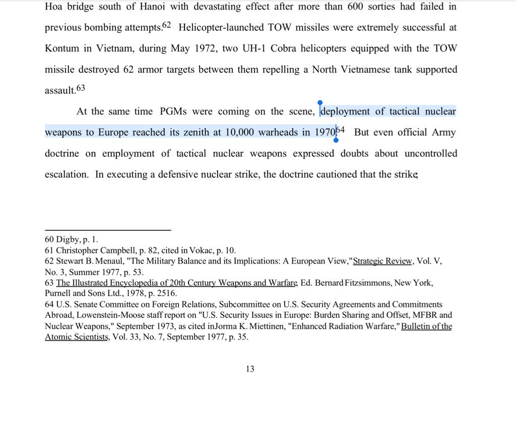In a late 2004 "Nuclear Notebook" in @BulletinAtomic, Stan Norris and @nukestrat wrote, "In 1971, the number of U.S. nuclear warheads based in Europe peaked at approximately 7,300 ... . By the late 1970s, this number had dropped to about 6,000." 1/2pic.twitter.com/vKpsGW0HwT