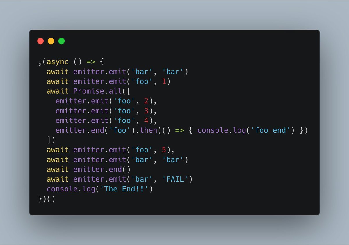 Found a bug and it took me down the rabbit hole and back :) But now the implementation works with parallel emits and queuing. https://gist.github.com/wesleytodd/ad293325a80de4be6cc4dd804441a99f …pic.twitter.com/C7jzap3LWL