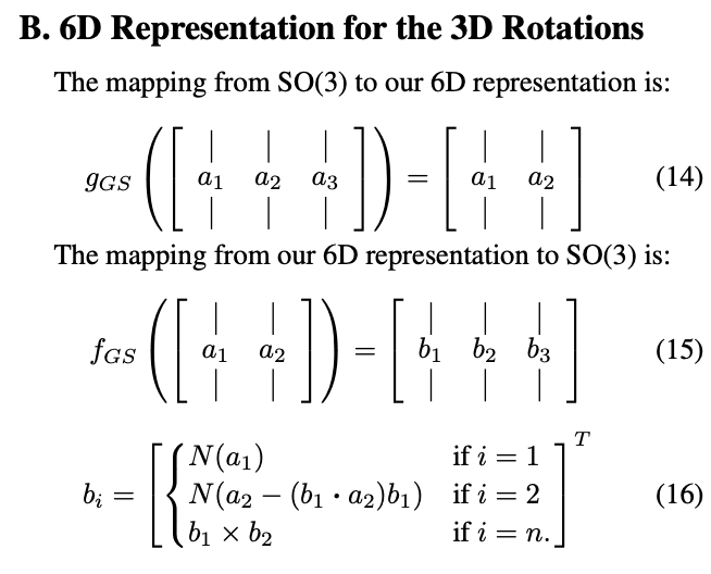Quaternions and Euler angles are discontinuous and difficult for neural networks to learn. They show 3D rotations have continuous representations in 5D and 6D, which are more suitable for learning. i.e. regress two vectors and apply Graham-Schmidt (GS). https://arxiv.org/abs/1812.07035 pic.twitter.com/fXUF3sgkTT