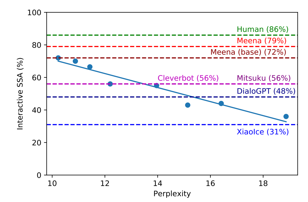 Towards a Human-like Open-Domain Chatbot: Near-human level open-domain chatbot is achieved with a Transformer LM with 2.6B parameters. Notably, they showed there's a strong correlation between ppl and human-likeness. https://arxiv.org/abs/2001.09977 pic.twitter.com/cT45Kre3Ur
