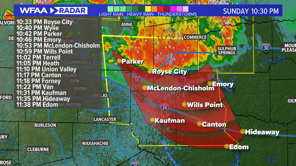 Severe Thunderstorm Warning for Collin, Dallas, Hunt, Kaufman, Rains, Rockwall and Van Zandt counties until 11:15 p.m. Damaging wind gusts up to 60 mph and pocket change size hail possible. Latest: https://www.wfaa.com/article/weather/buckle-up-our-first-100-day-is-in-the-forecast/287-986f60bb-ff9a-4fb2-b0b6-46fb81a12179 …pic.twitter.com/IfTFjGq8lK