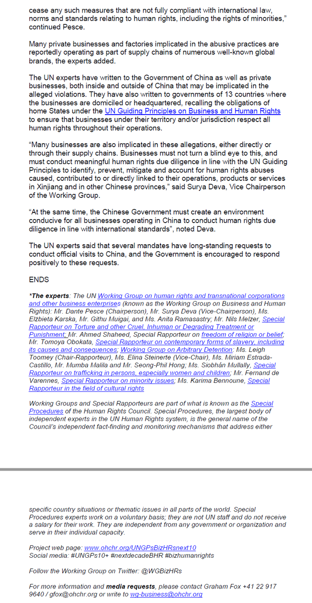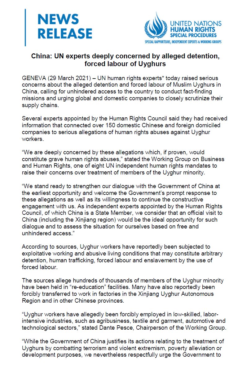 @WGBizHRs & several other@UN_SPExperts express deep concern re alleged forced labour of#Uyghurs in#Xinjiang & seek unhindered access for fact-finding@ARamasastry@TaraVanHo@hkjohnsonyeung@williamnee@justine_nolan@SZarifi@PhilALynch@pbloomer@alvinllum@StephenMcDonellpic.twitter.com/LTpRhYFKw2