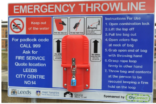 Waterways in Leeds City centre have throwline points each having an Identification reference for the Emergency Services to locate and provides rescue equipment