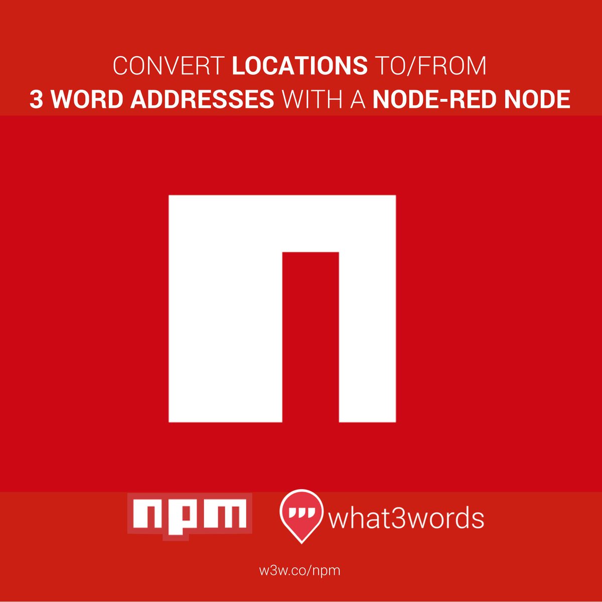 convert coordinates to 3 word addresses with node-red node #npm @npmjs #nodejs #nodered http://w3w.co/npm pic.twitter.com/RONJ36QFlQ