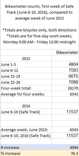 During SafeTrack, the Bikeometer has seen a 76% increase (1000+ more bikes) over last year! http://bit.ly/1oxSxGV pic.twitter.com/XOXiw8xptC