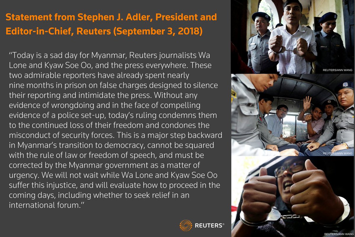 @Reuters statement responding to the outrageous attack on press freedom in Myanmar that has left two esteemed colleagues sentenced to seven years in prison for doing their jobs.pic.twitter.com/4NA8roc5cB