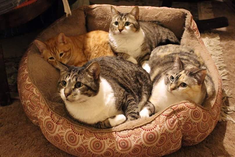 Just want to introduce you to Charlie, the Greatest Cat Dad Ever! That's him in the front of the bed, w/his 2 kiddos & their mom Fizgig. Charlie & Fiz showed up on my bro & SiL's doorstep together w/their kittens. & Charlie never left their side