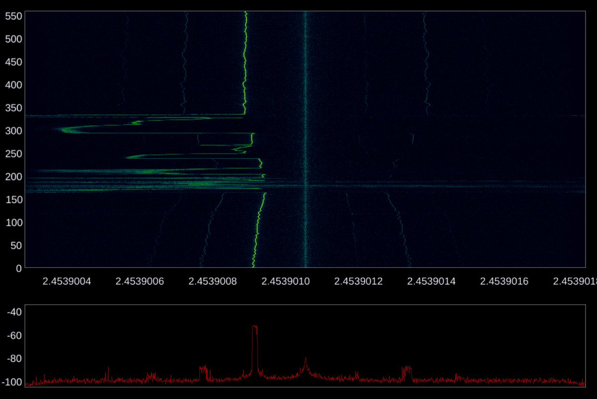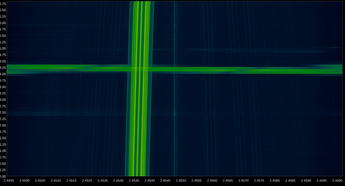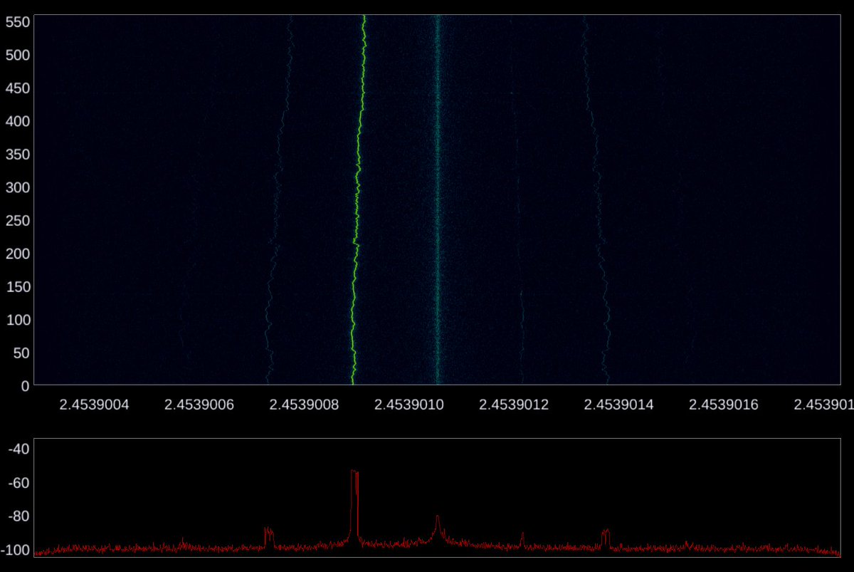 nRF24L01 has a mode where it just transmits its carrier (for compliance reasons) so i wondered how much it's going to drift. the answer is very very little. it's supposed to be at 2.454, so it's off by 40 ppm, but firmly in placepic.twitter.com/8t6rTWHqkG