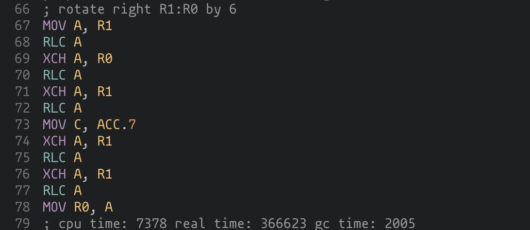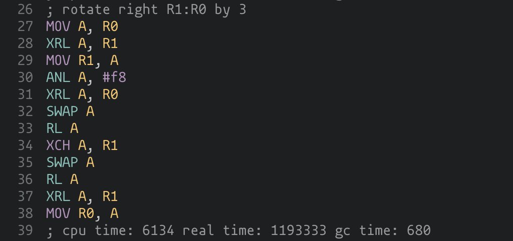 took me only 30 minutes of CPU time but now i know if there's a more efficient* way to rotate a multibyte value by 2 bits in 8051 than just rotating by one bit twice (the anwer is no, there isn't**)pic.twitter.com/MbfNCFT1R2