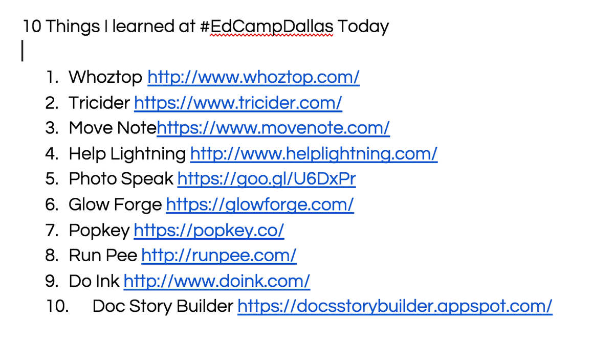 @lauren_dill: RT@techwnancy: Ten things I learned at#EdcampDallas today!pic.twitter.com/qHQRlDEsUx