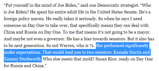 You also have to love the "strategist" saying that Biden shouldn't pick Warren because she "performed significantly under expectations" (as the second-to-last person to leave the race), so he should pick Harris (who went from a brief outright lead to flaming out in December)pic.twitter.com/yTMJnBC35U