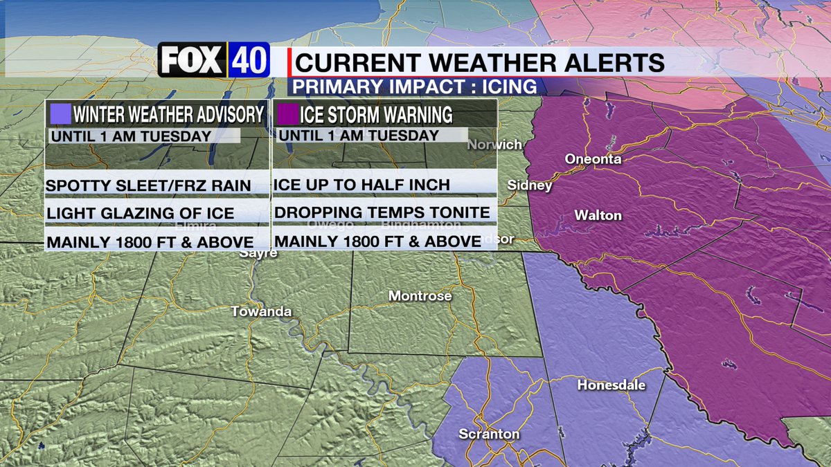 ICE STILL A THREAT AT HIGHER EASTERN ELEVATIONS Although the rain is tapering off, the advisories remain until 1 AM. Sullivan County was hardest hit, with half-inch ice reported at several areas above 1700 feet, along with some in Delaware and higher elevations around Otsego Lakepic.twitter.com/l0O7SZUc2V