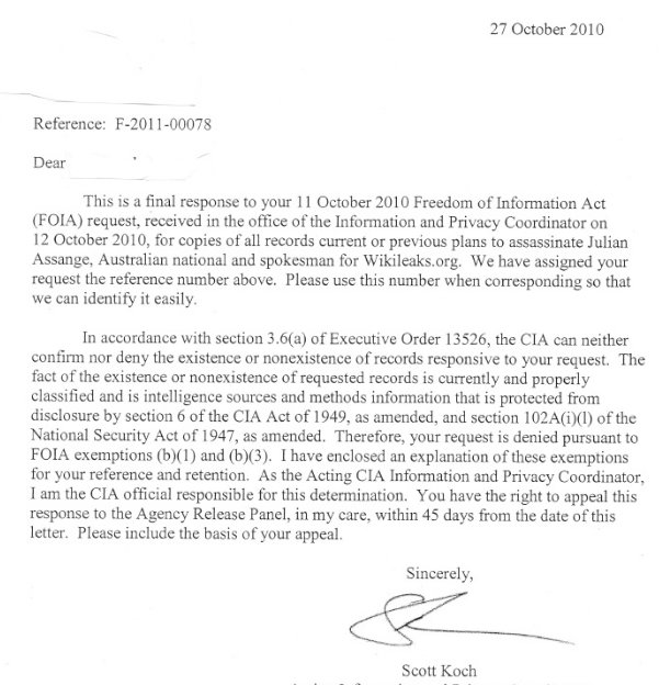 @wikileaks Oct 27, 2010#CIA response to#FOIA request refuses to confirm or deny plot to assassinate#Assange: https://www.scribd.com/document/41076931/CIA-Response-to-Assange-Assassination-FOIA …pic.twitter.com/XXFXsU4siF