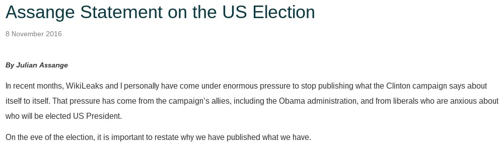 NYTimes pushes out its 2 month old WikiLeaks conspiracy during the middle of voting https://twitter.com/nytimes/status/796044621436420096 … Reply: https://wikileaks.org/Assange-Statement-on-the-US-Election.html …