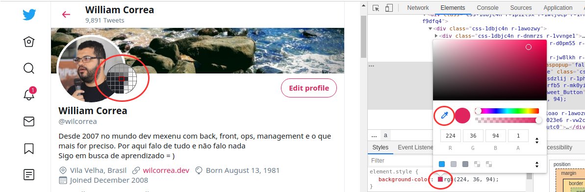 #dicasDevAleatorias Dá para usar o navegador para inspecionar as cores dos elementos da página. Abra as ferramentas do desenvolvedor, vá até Elements e clique no quadrado que indica a cor atual. Vai abrir um seletor de cores que tem um conta-gotas, use-o sobre a páginapic.twitter.com/2Kv75T59jg