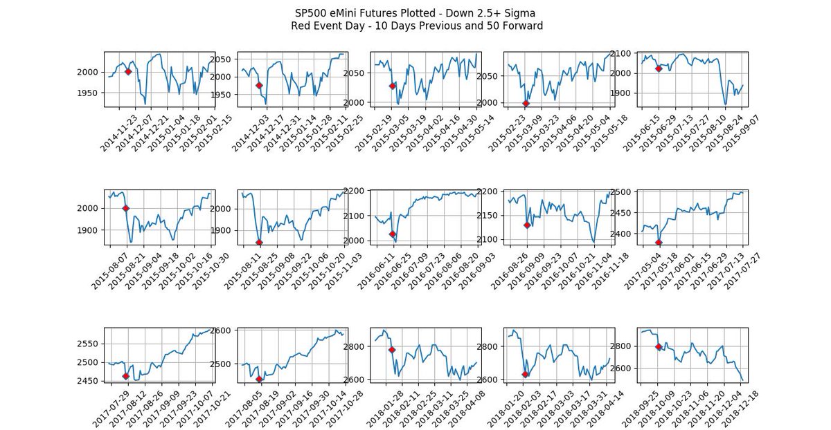 Market was down 2.5+ sigma Friday. Has been a good capitulation sign over past few years but Oct led to more. Here is last 15 occurrences with 10 days prior to event and 50 days fwd plotted.pic.twitter.com/6af3CkvcDb