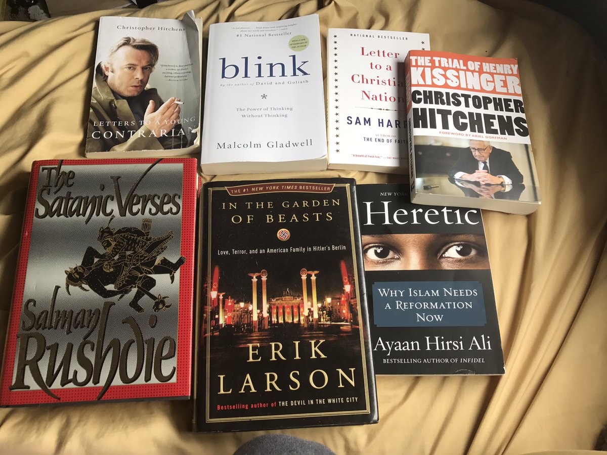 #books to read@Ayaan Heretic@SalmanRushdie The Satanic verses,@Gladwell blink theory,@SamHarrisOrg Letter to Christian nation,@exlarson In the Garden of Beasts, and some Christopher Hitchens bookspic.twitter.com/k3cP3tkiQX