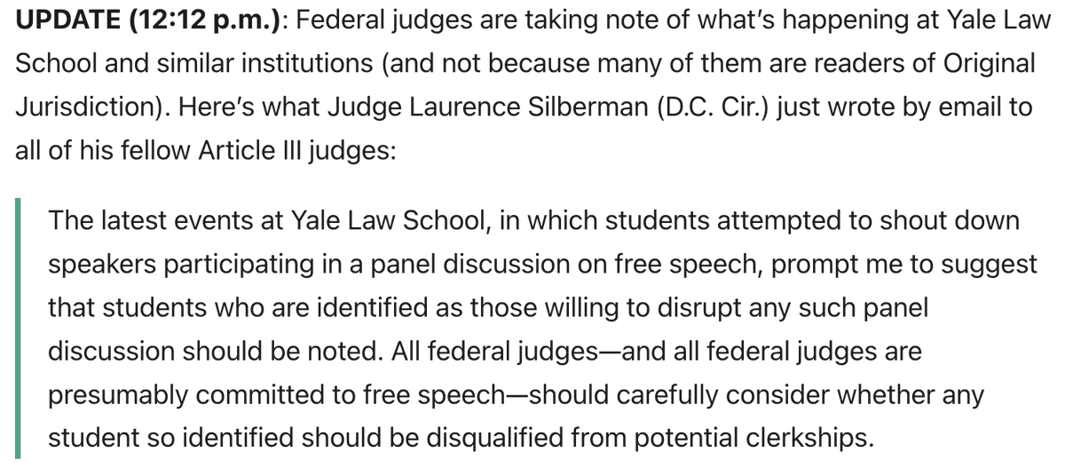 A DC circuit judge has encouraged all of his colleagues on the federal bench to "carefully consider" whether the Yale Law students who attempted to shout down a panel on free speech "should be disqualified from potential clerkships." Via