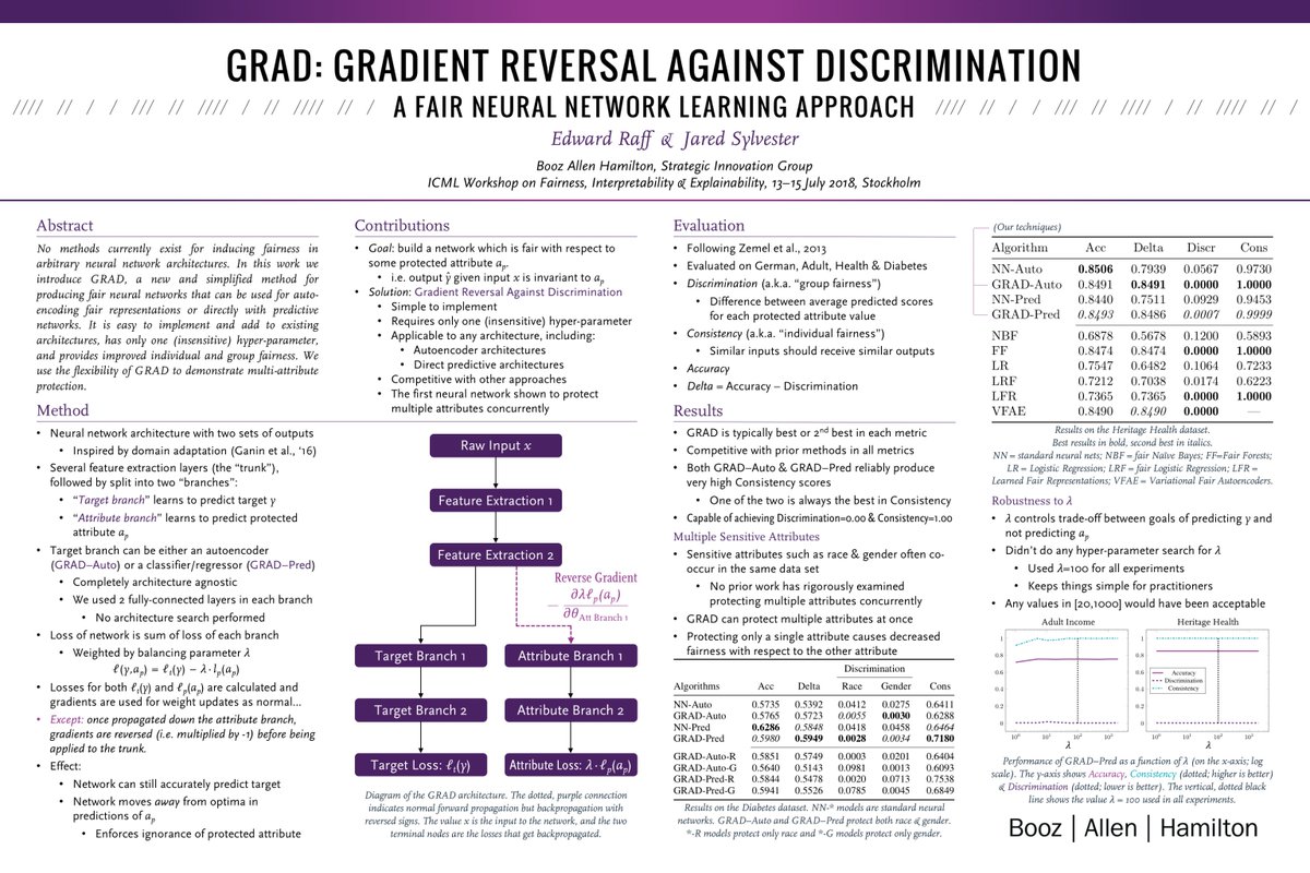 #ICML2018 attendees: check out@EdwardRaffML presenting some of our new work on Fair ML on Sunday https://arxiv.org/abs/1807.00392 https://www.fatml.org/schedule/2018 If reading the paper is too much here’s a haiku: Down the hill we descend, Climbing up from proscribed traits, Uphill, to fair nets.pic.twitter.com/RCxB8g311S