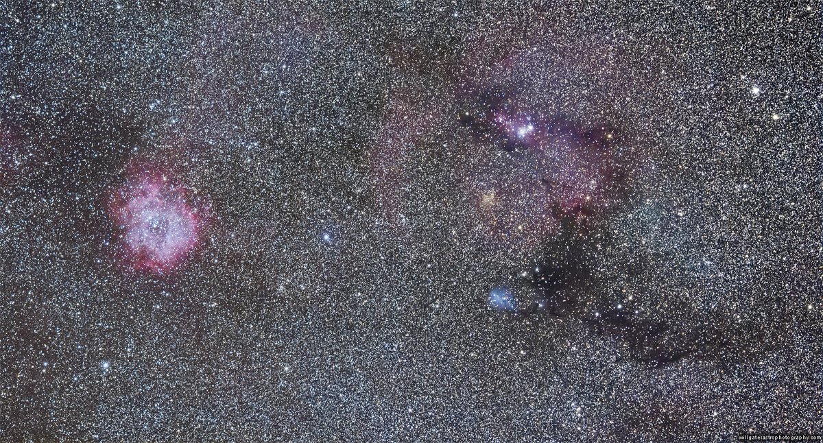 Here's a view of the Rosette Nebula nestled within the rich star fields of the winter Milky Way. Towards the upper right are the Christmas Tree Cluster & the Cone Nebula, which sit at one end of an enormous tendril of dark nebulosity. HQ version: https://www.willgaterastrophotography.com/galaxies-nebulae/vdnwuwz54e2xidrxsp22q7gr8dcj6w …pic.twitter.com/iUPKBusBxo