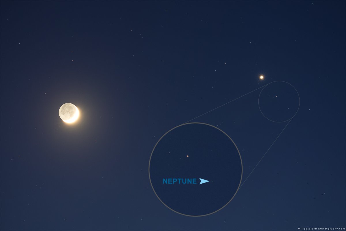 Quick shot of the crescent Moon and the planets Venus and Neptune at twilight this evening. In the UK they're just setting in the west now! HQ version: https://www.willgaterastrophotography.com/the-planets/enxzbki2ki708jmc65rbwwhny4l12e … cc