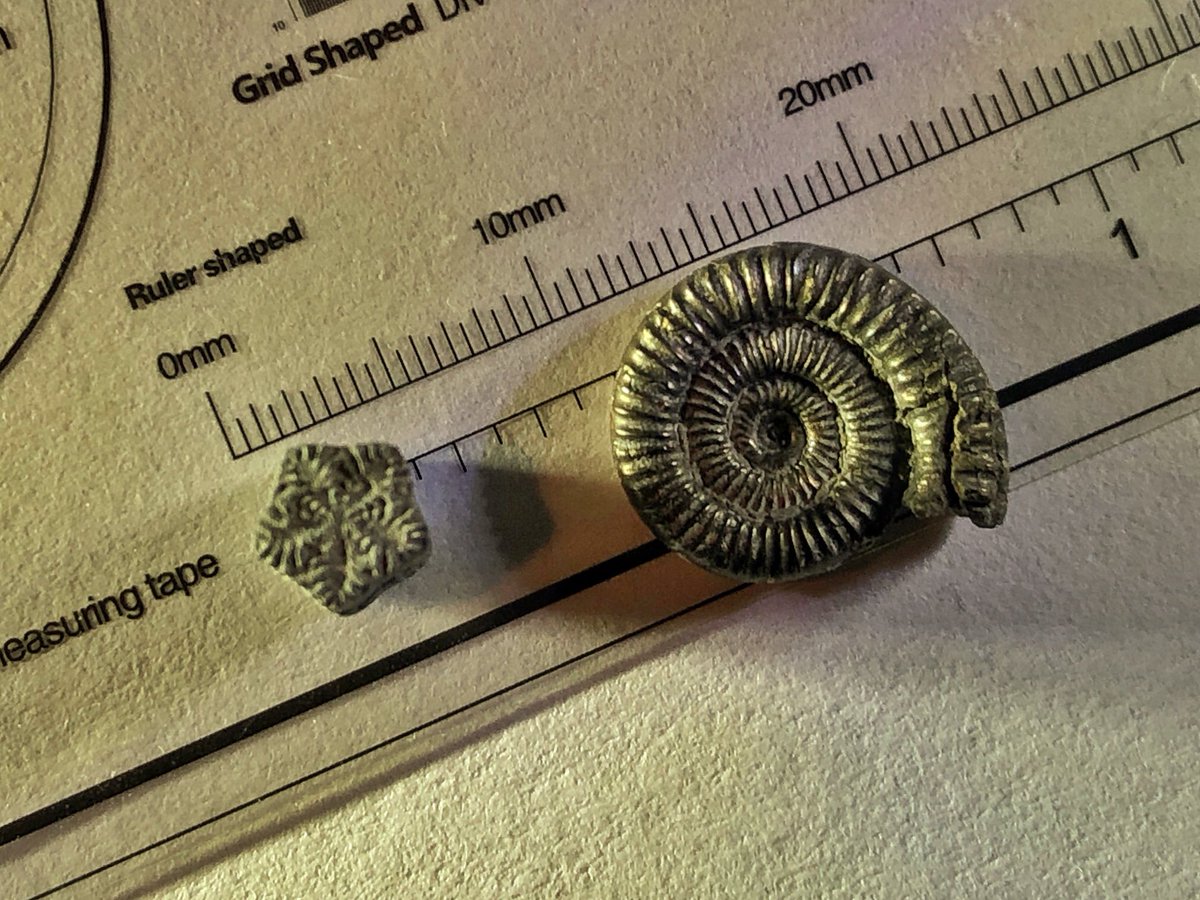 #FossilFriday here’s a tiny pyritised ammonite & a small piece of crinoid stem that I found at Charmouth recently (close-ups from a USB microscope). Both date to the Jurassic period, which means they’re about 200 million years old.pic.twitter.com/kTMTTNvkAR